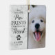 Husdjursminne julgransdekoration med foto av din älskade hund eller katt, en modern vit marmorbakgrund, ett tassavtryck med ett hjärta, ett medkänsamt minnesord som lyder "du lämnade dina tassavtryck för alltid på mitt hjärta", plus deras namn och datum. Placera den på din julgran eller någonstans i ditt hem, denna prydnad gör en unik present till någon speciell.
