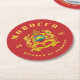 Den marockanska jackat av arm är centrerad mellan två textavsnitt. Den översta delen är land namn som är världsberömt, och den andra delen av texten är officiellen namn i land. Självständighetsåret är utmärkat över formgivningens mitten, och under emblemet är det en liten nationell flagga.