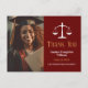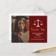 Elegant juristexamen tack-kort med rättvisans vågskål bredvid ditt examensfoto. Anpassa dessa advokat-kort med chic guld- och vit skrift bredvid din advokatfotografi.