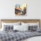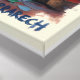 Resan in i den pulserande själen i Marrakech genom detta fängslande impressionistiska mästerverk som fångar magin i Nordafrikas mest förtrollande medina. En slående minaret i rik terrakotta och invecklad kakelmosaik reser sig majestätiskt över livliga marknadsstånd insvepta i färgrika markiser – strålande röda, gyllene gula, juveltonade teal och djupa purpurfärger som skapar en regnbågstäpp ovanför. Nedanför visar handlare upp rikliga skatter i korgar och trä lådor: lysande apelsiner, djupa vinröda och gyllene frukter som svämmar över den varma, soldränkta marknadsplatsgolvet. Elegant klädda figurer i traditionella djellabas rör sig genom de livliga soukerna, deras kläder återgivna i rika blå, burgunderröda och mjuka vita nyanser, och skapar ett organiskt mänskligt landskap fullt av liv och värme. Palmträd svajar försiktigt vid kompositionens kanter medan himlen exploderar ovanför i lysande blå och krämiga gula nyanser, virvlande med atmosfärisk rörelse och ljus. Konstnärens passionerade, texturrika penseldrag genomsyrar varje element med äkta energi och kulturell värme – från den utsmyckade arkitekturen till mängden varor och den mänsklighet som fl