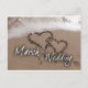 Två hjärtan i sanden med havsvågor och Mars Bröllop i vit script font. Perfekt design för att tillkännage ditt kommande Mars bröllop. Kärlek på stranden!
