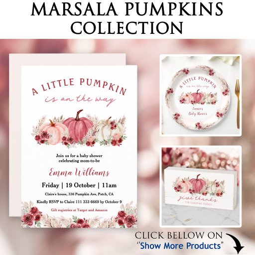 Lilla Pumpkin är på väg, eleganten sjunker hösten för babyskor Diaper Raffle Game Sign in Marsala burgundy, rosa och elfenben färg i boho stil med pumpor och pampasgräs. - Kate Eden Art