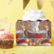 En festlig snömannen figur sitter iförd en tomtehatt på en röd mugg fylld med skummig varm choklad och sockertoppar.