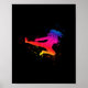 Kvinnlig martialartist som flyger genom luft med en stor spark. Multifärgad silhuett och måla stänk.