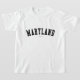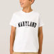 Kontrollera ut denna Maryland t-skjorta! Är du från Maryland? Har du en vän eller en familjemedlem som älskar Maryland? Om så, är denna "baner" t-skjorta exakt gåvan som du söker efter! Designen presenterar "Maryland" i välvd svart bokstäver i klassikerhögskolastilsorten.