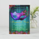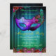 Maskeradbalen Firande Påfågel Inbjudan. En elegant och sofistikerad inbjudan med en maskeradmask i lila ton med svarta detaljer och neonskimrande stenar runt ögonen, en blå och grön ombre-bakgrund med ett subtilt damastmönster som övergår i svart och elegant typsnitt som kan anpassas för dina festdetaljer. Påfågelsfjädrar pryder masken och de nedre kanterna på inbjudan.