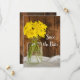 Ange en avslappnad till klassens ton för er förestående ceremoni i giftermål med charmen Mason Burk och Gult Daisyn Land Barn Bröllop spara datum. Detta informella och elegant anpassningsbar ranch-tema giftermål behålla om datumangivelsen innehåller ett digitalt förbättrat fotografi av blommigten av en burk som serverar glas med gult daisy blommor blommar och en rustik vävlad barrdaglig bakgrund av barrträ.