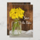 Ange en avslappnad till klassens ton för er förestående ceremoni i giftermål med charmen Mason Burk och Gult Daisyn Land Barn Bröllop spara datum. Detta informella och elegant anpassningsbar ranch-tema giftermål behålla om datumangivelsen innehåller ett digitalt förbättrat fotografi av blommigten av en burk som serverar glas med gult daisy blommor blommar och en rustik vävlad barrdaglig bakgrund av barrträ.