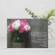 En bröllopsinbjudning med ett foto av en mason burk inlindad i burhönstråd fylld med rosa och vit ros över en bakgrund av laduvirke. Anpassa texten med information om tillfälle. Det är från brudens föräldrar.