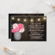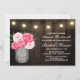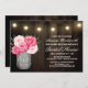 Mason Burk + Peony Rustic Inbjudningskort för möhippa - designen har en lada-bakgrund med strängen ljus överst med en bukett av peonier inuti en Mason burk med ord kärlek tryckt med elegant.