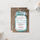 Rustic Land Mason Burk Rehearsal Dinner Inbjudan med tealblått accent Mason burk-design på en knapp bakgrund av träkornen. Den plågade träkonstruktionen är också på baksidan i färg, tillsammans med en liten mason burk i hörnet som säger "Kärlek". Lägg bara till din egen information om repetitionsmiddagen till den här mallen.