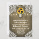 Mason Burk Solros Rehearsal Middag Inbjuds - har en unik barrträbakgrund med elegant snöre och tinkle string ljus. Denna utformning har också en mason burk fullt av solblommor och baby utandning. Mason burk är dekorerad med initialer som du kan byta till dem du själv väljer.