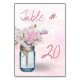 Söta Pea Bord Card - Vintage blue mason burk bunden med jute twine och en bouquet sötärtblommor i pastellskuggor av kräm och rosa placerad framför en rosa vattenfärgad bakgrund med målad bakgrund. © 2015 Originalfärgning av vattenfärg efter WhimsicalArtwork™ Perfekt för det landsbyggsbröllopet eller vintagen party.