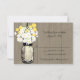 Svarskort -- Perfekt för en landsbygdbröllop eller kanske för att du älskar Masonburkar! Masonburk hängande i en krok fylld med vilda blommor. En mörk taupe (X07531) gammal träpanelbakgrund mot den hängande Masonburken med gula Billy-bollar och vilda vita prästkragar. Om du har några frågor om denna design eller vill ha en färgändring, vänligen maila mig paula@labellarue.com Kontrollera också MAIN INVITE, RECEPTION och GUEST SEATING-korten för att matcha!