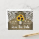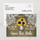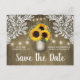 Masonburk Rustika Solros Spara datum Postkort - har en unik lada träbakgrund med elegant spets och gnistrande sladdljus. Denna design har också en masonburk full av solrosor och babysand. Masonburken är dekorerad med initialer som du kan ändra till dina egna.