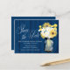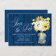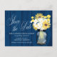 Masonburk Spara Datum: Perfekt för en landsbygdbröllop eller kanske du bara älskar Masonburkar! Gammal vintage Masonburk med Vita Prästkragar, Solrosor och Gula Billy Boll vilda blommor. En Navy Blå Ladan Trä bakgrund. Om du har några frågor om denna design eller vill ha en färgförändring, vänligen maila mig paula@labellarue.com