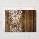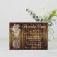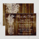 Spara datum bröllopskort. Präglad bild av masonburk i vitt på en bakgrundsbild av mörkbruna träplankor (inte äkta trä). Ett halvgrungigt utomhus tema för ett lantligt sommar- eller stugbröllop. Mörk chokladbruna träbrädor från ett gammalt staket eller golvbrädor kontrasterar mot en vit utskuren präglad bild av en masonburk med baby´s breath och andra spetsiga vilda blommor. Alla mönster Copyright © www.CustomInvitesOnline.com