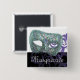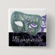 Knappen Fyrkant med en bild av lila snöre över svart, en vacker mask med rosett band av blått, guld, grönt, lila och fuchsia med gnistrande silver trim. Anpassade text i skript för silver Fransk. Se matchning av nyckelkedjan metall med stort kvadratiskt spetskompetens och kvadratiskt halsband. Se hela samlingen Mardi Gras Buttons & Stift i SPECIELLA TUUCHES | Avsnittet Party favors.