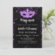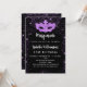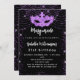 För en elegant Masqueraad, 21:a (eller någon annan ålder) födelsedagsfest. En klassisk svart bakgrund. Dekorerad med lila faux glitter-gnistor och en maskerad mask. Anpassa och lägg till information om namn, ålder och party. Namn är skrivet med ett handskript i stil