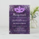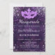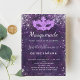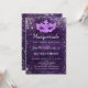 För en elegant Masquerad, Quinceañera, 15:e födelsedag. En djup lila blommigt snöre mönster som bakgrund. Dekorerad med faux silver glitter damm och maskerad mask. Anpassa och lägg till information om namn, ålder och party. Namn är skrivet med ett handskript i stil