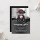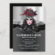 Ansikte på en vacker kvinna med blek vit hud har ruby red lipstick på sig och en faux silver och svart mask som fylls med röd ros och luddvallage. Hon ställs in mot en glansig silver och svart bakgrund som innehåller redigerbara vita mallar för din anpassningsbar. Den här eleganten, lyxig, trendig- och glam-designen är perfekt för en bachelorette, födelsedags, sweet sixteen eller quinceanera party. Anpassa bara de redigerbara textmallarna till kostym vid ditt speciella tillfälle.