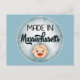 Det här roliga vykortet har en söt vit baby ansikte som säger "Made in Massachusetts" på blå bakgrund. Perfekt för tillkännagivanden från nyfödd bebis eller bara för roligt.