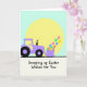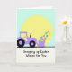 Denna gratulationskort visar ett lavendel-färgat tungt fordon parkerat i det nedre vänstra hörnet, med sina klumpiga svarta däck och stora främre skopa vinklade som om det försiktigt tippar en present framåt. Från skopan rullar prickiga äggformer ut i mjuk rosa, ljust blå, bladgrön och varm gul, och sättet de rinner ut tillsammans känns som en söt delad stund mellan vänner 🐰. En stor solgul cirkel sitter högt upp i bakgrunden som en lysande sol, som kastar en mysig och tillgiven stämning över scenen. Himlen bakom den är en blek aqua, som håller fokus på de pastellfärgade äggen när de sprider sig över den krämfärgade marken. Nära botten är en kort påskhälsning handskriven i mörk kol, centrerad längst ned på sidan så att den läses strax under de rullande äggen 🌷. Texten ligger på öppen yta med gott om andrum, vilket gör meddelandet lätt att upptäcka utan att tränga undan illustrationen. Platta fär