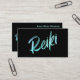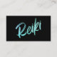 Detta unika och kraftfulla Reiki-affärskort som säkert imponerar. Den gnistra iridescent turkoshalten och gradienten färger i Reiki-typografin poserar på ett fint sätt mot den svarta bakgrunden.
