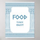 Elegant Toga-partys skylt 'Mat, tack' med eleganta tempelpelare och grekiskt meander-mönster i blått. Perfekt för dina bröllop, förlovningar, examensfiranden, årsdagar, save the date, möhippor och födelsedagsfester med tema Antikens Grekland eller Antikens Rom.
