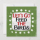 "Mata Fåglarna" är en söt textdesign i grått med svart och röd text, tillsammans med en vit accentform och vita texturerade vita punkter runt den.