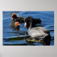 En söt liten baby Eurasian Coot ser förväntansfullt ut ut på sin förälder som väntar på att bli matat. Tagen i Roath Park Sjö, Cardiff, Wales.