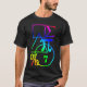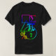 Ett abstrakt mönster av geometriskt och matematiskt formar och symboler på en mörk t-skjorta.