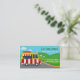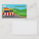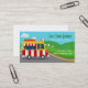 Ett gladlynt kort för en matlastbilaffär med en färgrik matlastbil i rött och vit görar randig på vägen med gröna backar och blå himmelbakgrund.