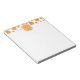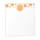 Ett vitt anteckningsblock med gräns av leende persikor med grönt löv. Överst finns en kombination av namn och monogram som kan anpassas. Knappen är för det mesta tom med gott om skrivutrymme.