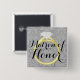 Matronen av hederslag klämmer fast knäppas är ett användbart verktyg för portion som nya familjemedlemmar känner igen vem är i bröllopsfesten. Skrivar grå damastast bakgrund för eleganten med guld- den utsmyckad solitairediamantringen som är grafisk och, text.