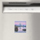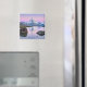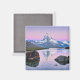 Fotomagnet från Souvenir, som reflekterar det mäktiga Matterhorn-berget i Stellisee sjö fortfarande vatten högt i Alpernorna ovanför Zermatt, Schweiz vid soluppgången.