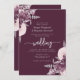 Den här inbjudan från elegant bröllop innehåller stora blommigt-buketter som sätts av med silver faux foil grey i två hörn, på en djup lila bakgrund. Anpassadet kombinerar silver grått serif, italic och handskrift typsnitt. Blommigtens utformning upprepas på baksidan.
