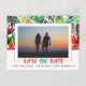 Med detta sjudande och livliga vykort i Spara datum meddelande får du en maximalistisk utformning med en spricka av färgstarka tropiska löv och en snyggt rektangulär ram. På högst två tredjedelar av vykortet bakom fotot finns det en fängslande mönster av tropiska löv som tillför en aning exotisk skönhet. Under parets foto visas frasen "Spara datum" djärvt i en sjudande typografi av grönt och orange, vilket skapar en slående kontrast mot lush-bakgrunden. Datum och namn för paret är elegant med, vilket fullbordar denna öga-fångst och minnesvärda inbjudan.