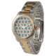 Denna klocka har en modern utformning av öppna orangar med gedigna tealcirklar som löper över mönster med teal lodrät linjer och orange vågrät linjer.