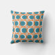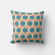 Dekorativ kudde har en modern utformning av öppna orangar i mitten av århundradet med solida tealcirklar som löper över mönster med teal-lodrät linjer och orange vågrät linjer.