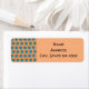 Dessa returetiketter har ett modernt mönster i mitten av århundradet med öppna orangar med gedigna tealcirklar som löper över mönster med teal lodrät linjer och orange vågrät linjer.