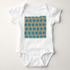 Denna karosseri i baby har en modern utformning av öppna orangar med solida tealcirklar som löper över mönster med teal-lodrät-linjer i linjer och orange-vågrät på fält av teal.