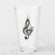 Mechanical clef and flowers to the beat of the clocks. A steampunk-style treble clef, rendered in dark metal with bronze accents and intricate detailing. The clef is adorned with blue flowers that have clock faces at their centers, adding a whimsical touch. Musical notes float near the clef, and small droplets hang from its curves.