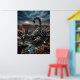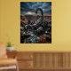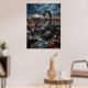 A dramatic alien desert crater reveals the remains of a colossal mechanical structure emerging from crimson sands and fractured rock. The scorpion-like form appears ancient and monumental, integrated into the landscape as a forgotten relic. Reflective surfaces, acid-washed terrain, and storm-lit skies create a powerful cinematic mood. Subtle neon highlights shimmer across metallic textures, adding depth and contrast to the dystopian environment. This artwork blends industrial design with sci-fi storytelling, making it a bold statement piece for modern interiors inspired by futuristic ruins and atmospheric worlds.