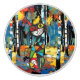 En viskös katt med ett geometriskt utseende av nedfläckad-glas står i en vibrerande skog av björk träd. Bakgrunden har en färgstark blandning av höst löv och blått och gult. Digital Art Photoshop