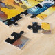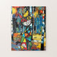 En viskös katt med ett geometriskt utseende av nedfläckad-glas står i en vibrerande skog av björk träd. Bakgrunden har en färgstark blandning av höst löv och blått och gult. Digital Art Photoshop