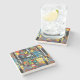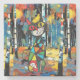En viskös katt med ett geometriskt utseende av nedfläckad-glas står i en vibrerande skog av björk träd. Bakgrunden har en färgstark blandning av höst löv och blått och gult. Digital Art Photoshop