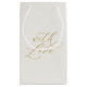 En elegant elfenbensvit presentbag för brölloppsgåvor med delikat ”Med kärlek”-kaligrafi i en mjuk neutral ton.
