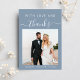 Tack för det dammiga blåa bröllop-kortet i eleganten med foto från bröllopsdagen, "Med Kärlek och tack" i en blandning av enkel modern vit typografi och ett chic vitt skript med dekorationer och ditt första namn och bröllop-datum gått med av ett hjärta. Anpassa ditt tackmeddelande och lägg till namn i ett namnteckning skript.
