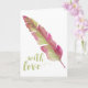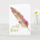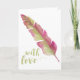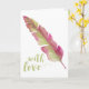NewParkLane - Vykort: Elegant boho-design med en grön och rosa fjäder i akvarell, med citat: 'med kärlek' i grönt, elegant, handskriven typografi.